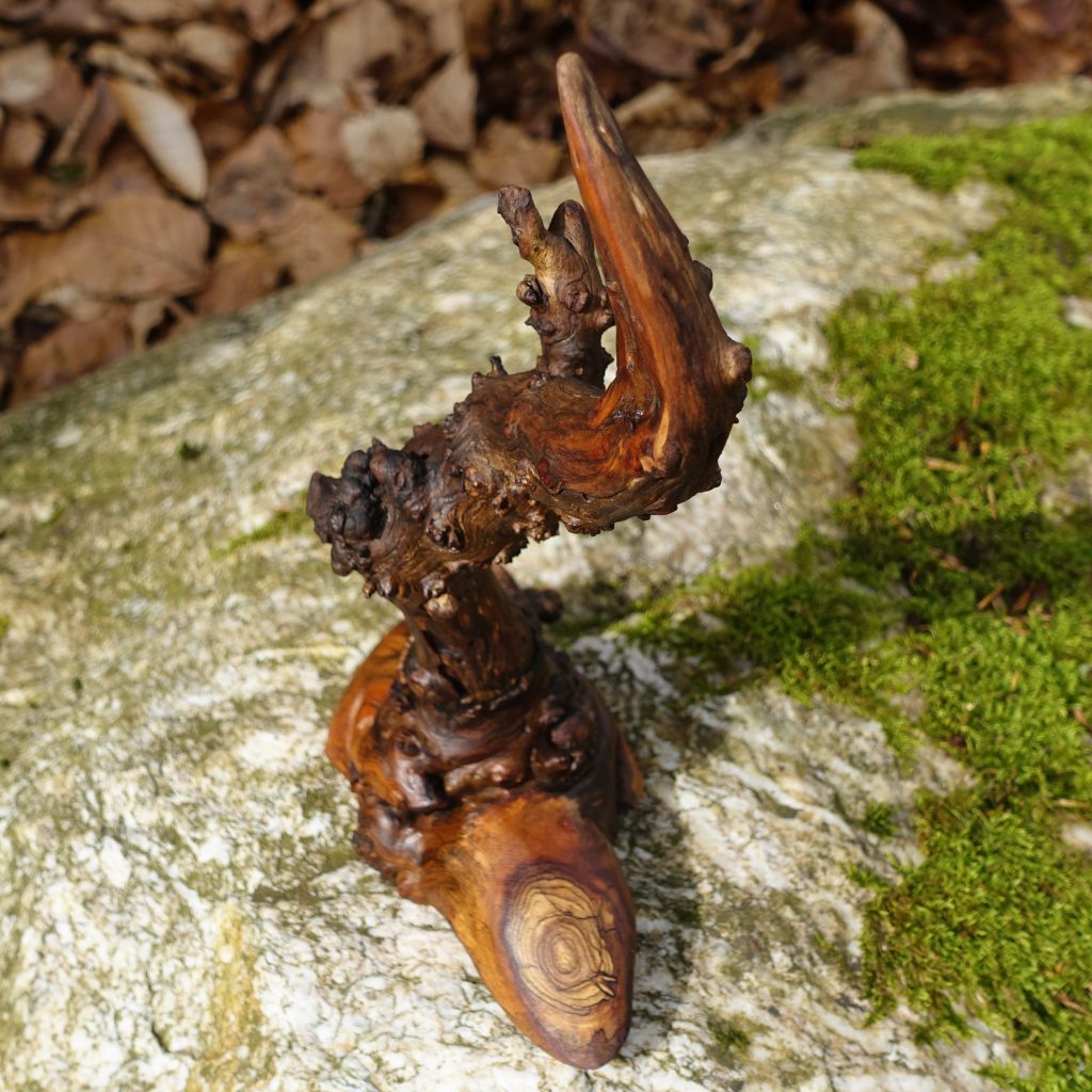 Der Fuß, auf dem der Vogel sicher steht, ist jedenfalls aus dem Stamm und Astquirl einer vertrockneten kleinen Fichte entstanden.