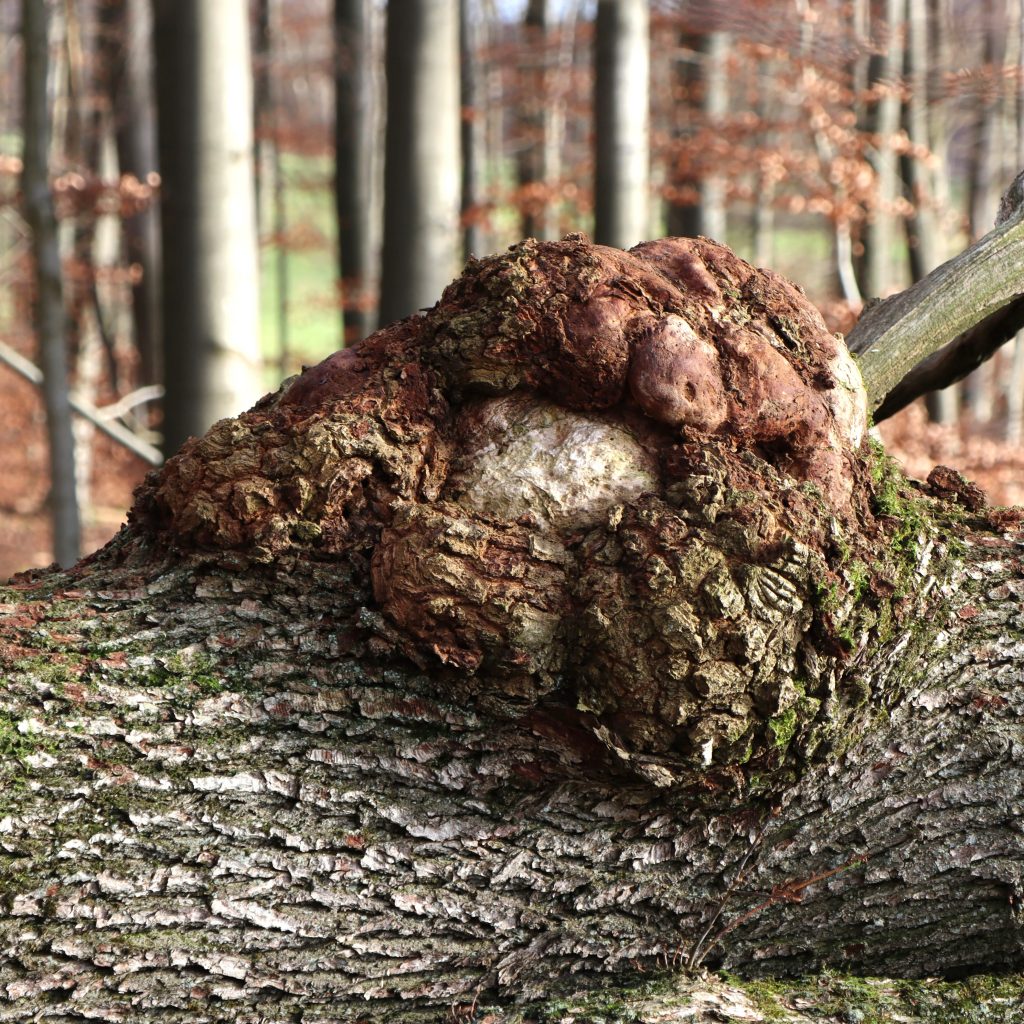 Baumkrebs führt nicht selten zu außergewöhnlichen Mustern, die mit der eigentlichen Maserung des Baumes nichts gemeinsam haben. (Näheres zum Thema Baumkrebs unter Nr. 19.)