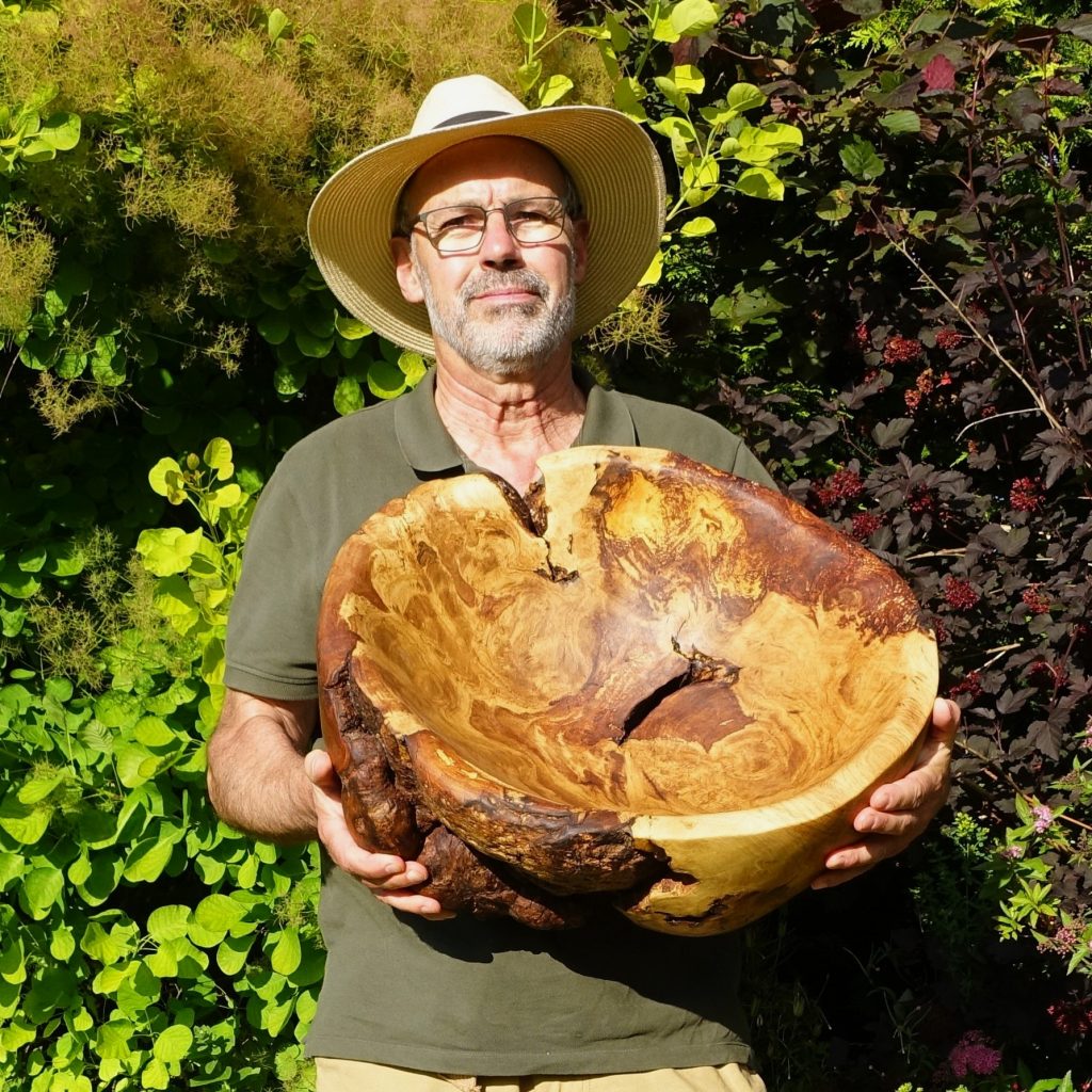 Die große Schale ist aus einem Walnussbaum entstanden, der im Nachbarort Horbach in einem Garten gefällt werden musste. Der Stamm, von dem ich einen Abschnitt geschenkt bekam, wies schon zu Lebzeiten des Baumes einen langen Riss auf, durch den Feuchtigkeit ins Holz eingedrungen ist und dieses stellenweise dunkel verfärbt hat. Auch das ist Natur und gibt der Schale einen besonderen Reiz. Einen völlig intakten Walnussbaum würde wohl auch niemand fällen.